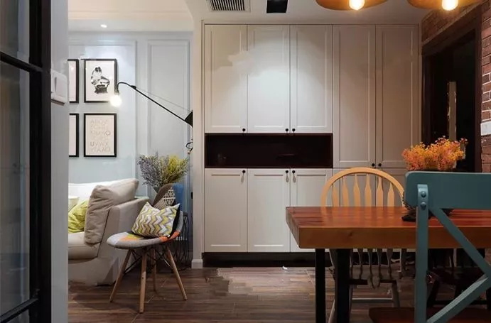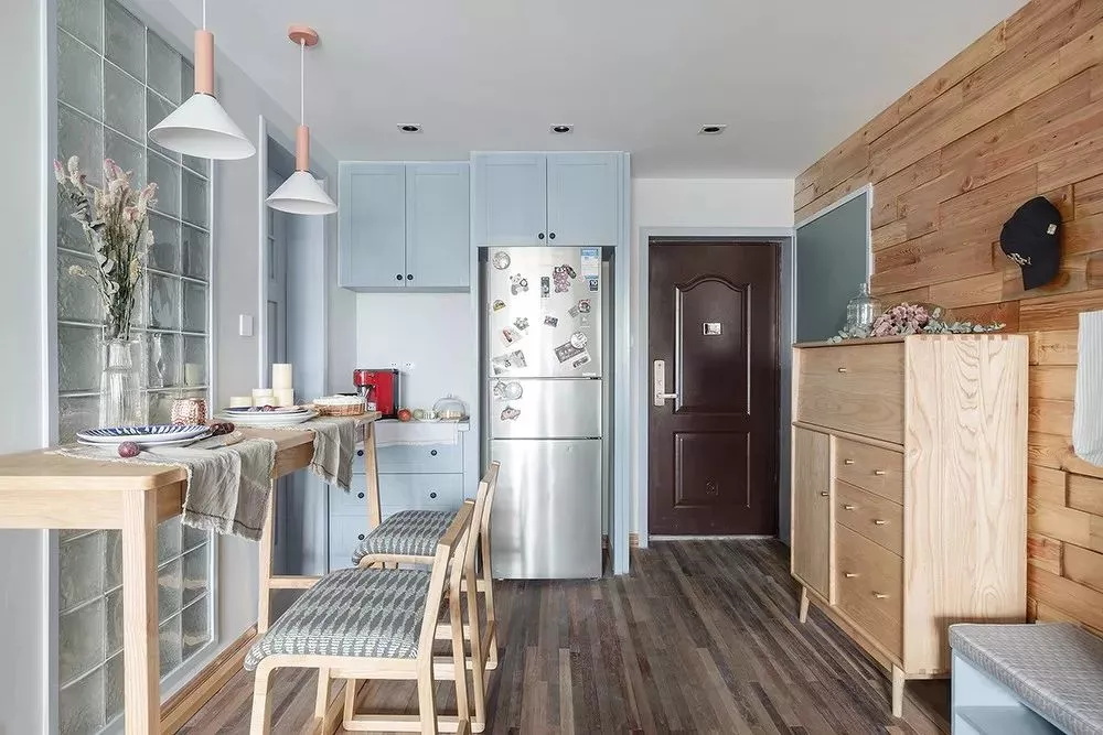 沒(méi)有空間設(shè)置玄關(guān)柜,怎么辦?直接順著墻壁在餐廳這里做一個(gè)柜子隔斷,使大門處形成一個(gè)過(guò)道式的玄關(guān),另一側(cè)則是餐廳。這樣一來(lái),不僅玄關(guān)有了,柜子的收納能力也是杠杠的,而且還順帶遮擋了餐廳空間,保持了私密性。