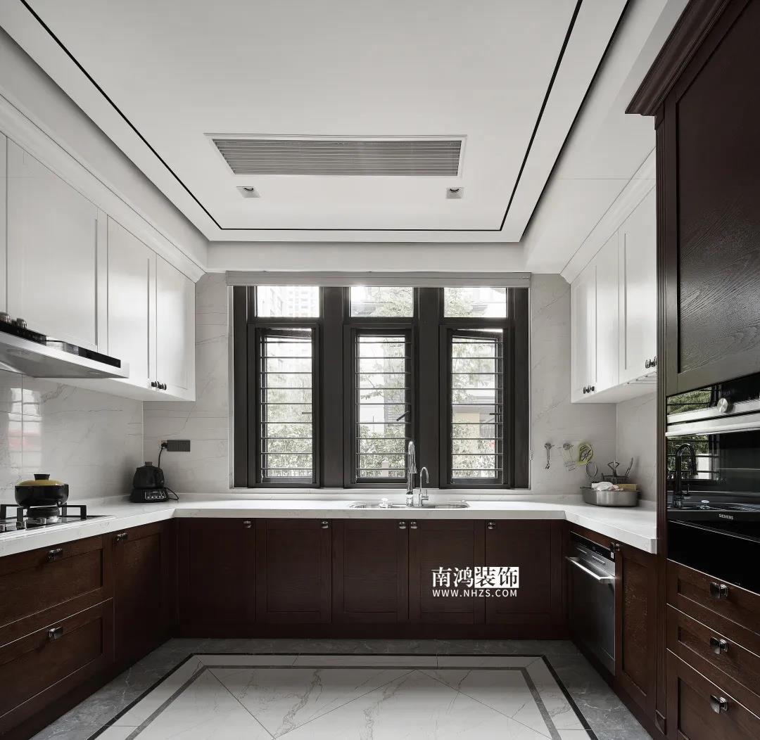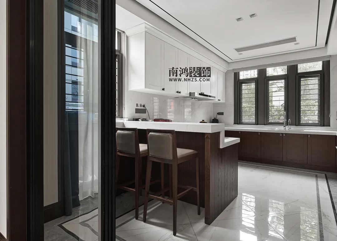 廚房,白色吊柜搭配木質(zhì)地柜,細(xì)致莊重,現(xiàn)代化的內(nèi)嵌廚電打造出設(shè)備齊全的料理空間,靠門一側(cè)還設(shè)計了吧臺。
