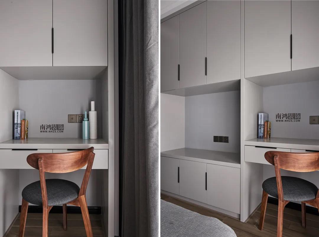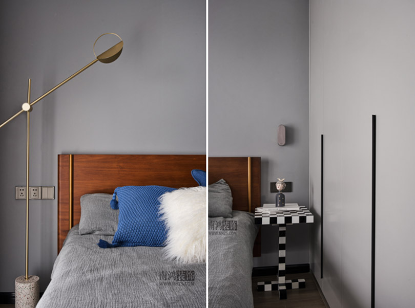 次臥以不同階度的灰色打造,色調(diào)統(tǒng)一的同時又巧妙劃出了層次,一角黑白塊樣式的小幾替代了床頭柜,是個小亮點(diǎn)。