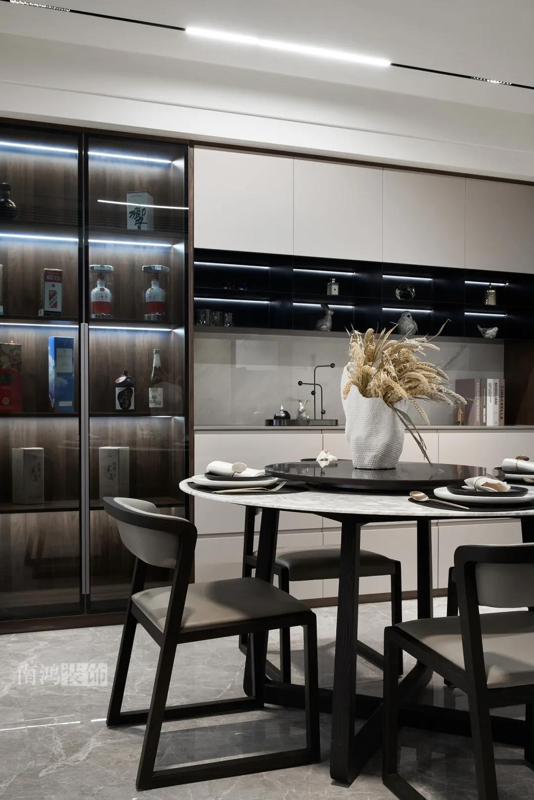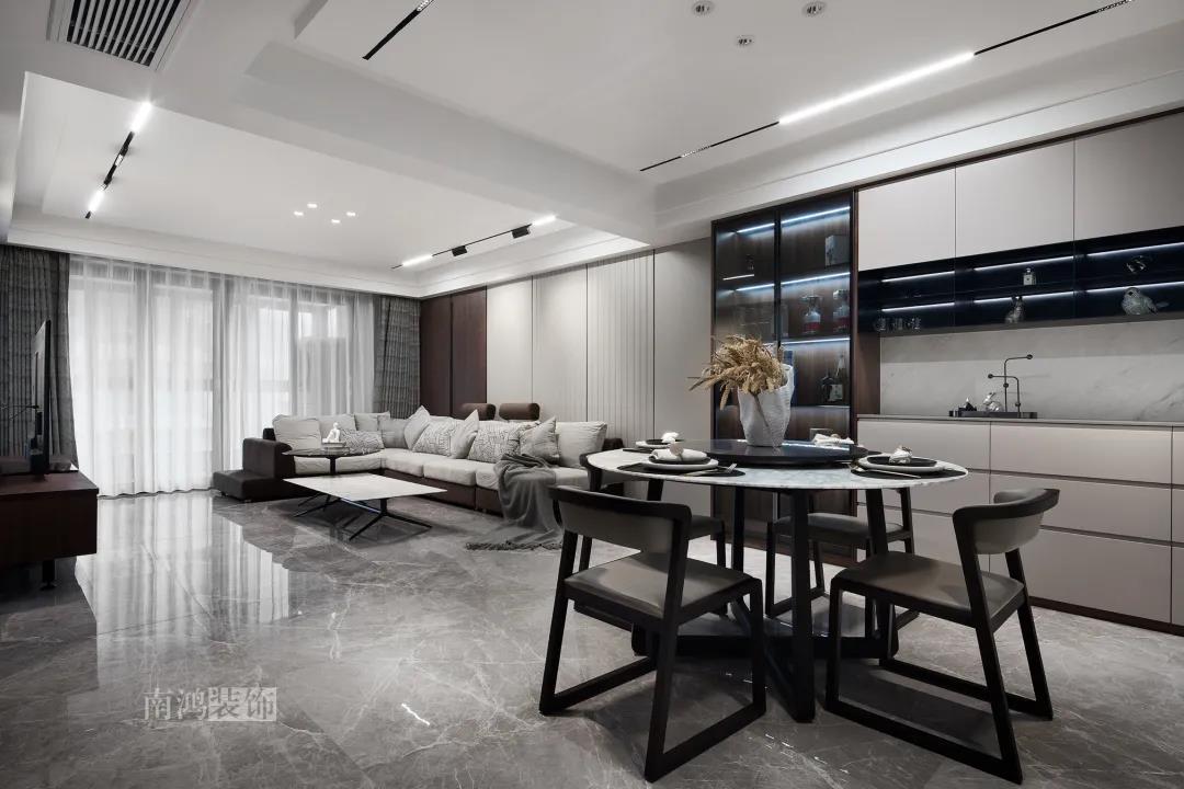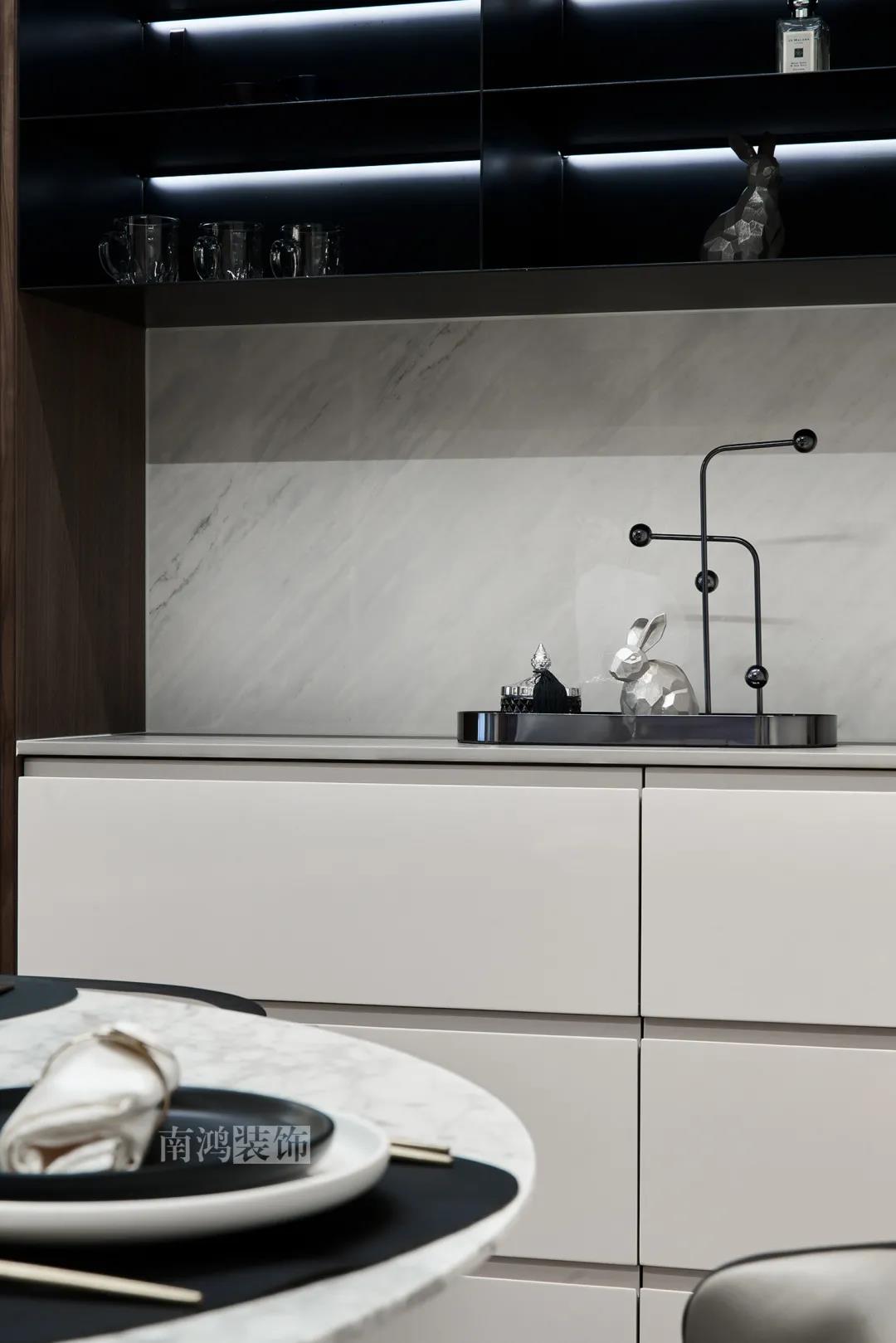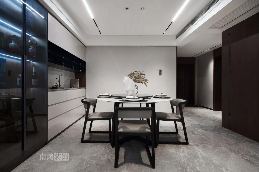 本案是一套老房翻新的項目,業主是咱們南鴻的老客戶了,這次找到我們把這套房子重新裝修,將來可以做女兒的婚房。 作品配色上是經典的黑白灰,家具有特意選用業主喜愛的黑胡桃木材質,黑胡桃木家具顏色深沉,紋理豐富明晰,將整體家居氛圍襯得是更有質感。 玄關 ENTRANCE 穩重有序的設計基調,從玄關開始。隱形門將通往衛生間的入口完全隱藏,使視覺效果得到高度統一,正前方與右側的柜子起到玄關收納的作用。 敲墻后打造出的雙面柜體結構,厚重的體塊既能做區域間的有效分隔,又是以一種深沉的姿態,喚醒人內心的安寧與平靜。 客廳 LIVING ROOM 客廳用材以石材與黑胡桃木為主,頂面的軌道燈可延伸視線,軟硬材質的恰當配比,冷暖色調的合理調配,讓空間的每一個節點都有著舒適感的存在。 豐富的紋理與材質變化之中,藏著有跡可循的規律,彼此呼應,以現代主義美學手法所搭配出的室內陳設,帶來飽滿的美感。 客餐廳區域原本就十分寬敞,空間相互自由流通,大氣的感受撲面而來。 餐廳 DINING ROOM 餐食空間自成一處,含蓄的色調端莊穩重,墻面留白保持了簡練質感。木質元素調和石材與玻璃的冷冽,光影交錯間切割出虛實之境。 公共區域的收納在居住日常中相當重要,合理的配置和分區,更利于保持這里的長期整潔,像餐廳做了長排的餐邊柜與一組酒柜,看著就清爽利落。 廚房 KITCHEN 廚房采光不是特別好,所以用了白色的櫥柜和淺色的瓷磚來呈現明凈的空間感,黑色臺面是它們的最佳拍檔。 臥室 BEDROOM 公共空間的元素都被延續到了這里,格柵、硬包、墻布...光源有層次的排布,讓空間有了無比溫馨的格調。 屋子的收納重心被放到了次臥,榻榻米除了能承擔儲藏功能之外,也是平時一個好的休閑去處。 衛生間 BATHROOM 衛生間以白色為基調,體現出空間的干凈整潔,自帶漸變紋理的瓷磚,起到華麗的視覺效果,整體營造出明亮、優雅的感覺。