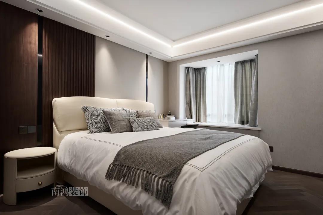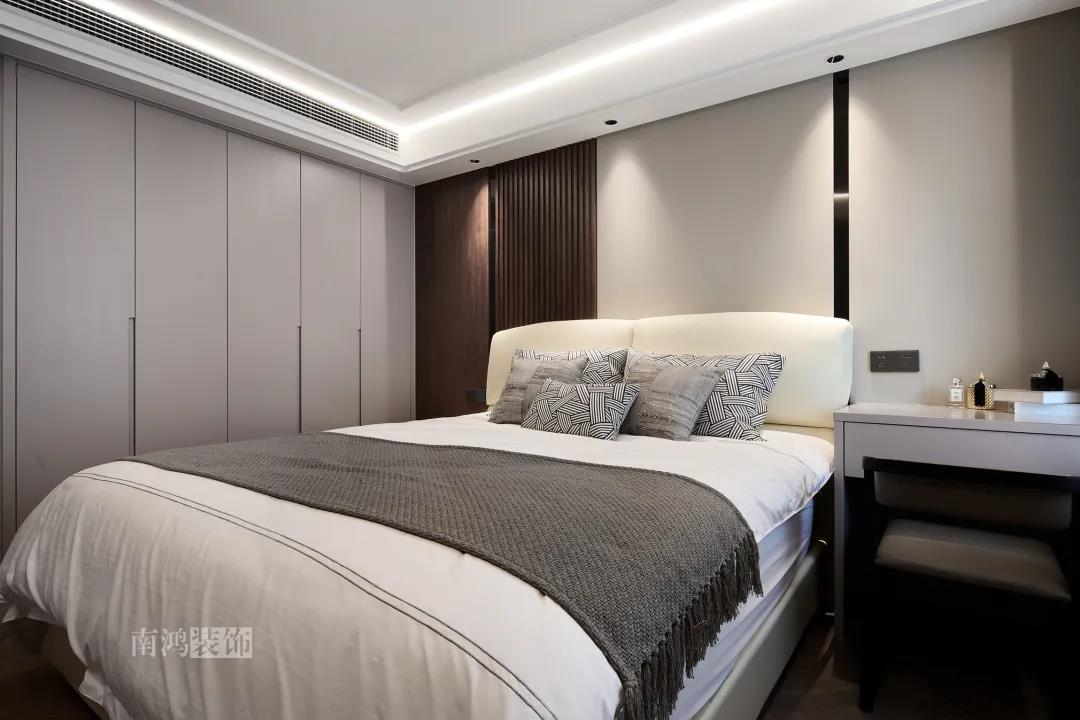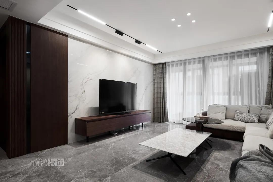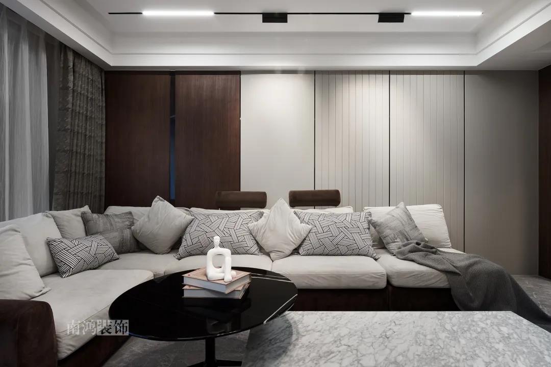 本案是一套老房翻新的項目,業主是咱們南鴻的老客戶了,這次找到我們把這套房子重新裝修,將來可以做女兒的婚房。 作品配色上是經典的黑白灰,家具有特意選用業主喜愛的黑胡桃木材質,黑胡桃木家具顏色深沉,紋理豐富明晰,將整體家居氛圍襯得是更有質感。 玄關 ENTRANCE 穩重有序的設計基調,從玄關開始。隱形門將通往衛生間的入口完全隱藏,使視覺效果得到高度統一,正前方與右側的柜子起到玄關收納的作用。 敲墻后打造出的雙面柜體結構,厚重的體塊既能做區域間的有效分隔,又是以一種深沉的姿態,喚醒人內心的安寧與平靜。 客廳 LIVING ROOM 客廳用材以石材與黑胡桃木為主,頂面的軌道燈可延伸視線,軟硬材質的恰當配比,冷暖色調的合理調配,讓空間的每一個節點都有著舒適感的存在。 豐富的紋理與材質變化之中,藏著有跡可循的規律,彼此呼應,以現代主義美學手法所搭配出的室內陳設,帶來飽滿的美感。 客餐廳區域原本就十分寬敞,空間相互自由流通,大氣的感受撲面而來。 餐廳 DINING ROOM 餐食空間自成一處,含蓄的色調端莊穩重,墻面留白保持了簡練質感。木質元素調和石材與玻璃的冷冽,光影交錯間切割出虛實之境。 公共區域的收納在居住日常中相當重要,合理的配置和分區,更利于保持這里的長期整潔,像餐廳做了長排的餐邊柜與一組酒柜,看著就清爽利落。 廚房 KITCHEN 廚房采光不是特別好,所以用了白色的櫥柜和淺色的瓷磚來呈現明凈的空間感,黑色臺面是它們的最佳拍檔。 臥室 BEDROOM 公共空間的元素都被延續到了這里,格柵、硬包、墻布...光源有層次的排布,讓空間有了無比溫馨的格調。 屋子的收納重心被放到了次臥,榻榻米除了能承擔儲藏功能之外,也是平時一個好的休閑去處。 衛生間 BATHROOM 衛生間以白色為基調,體現出空間的干凈整潔,自帶漸變紋理的瓷磚,起到華麗的視覺效果,整體營造出明亮、優雅的感覺。