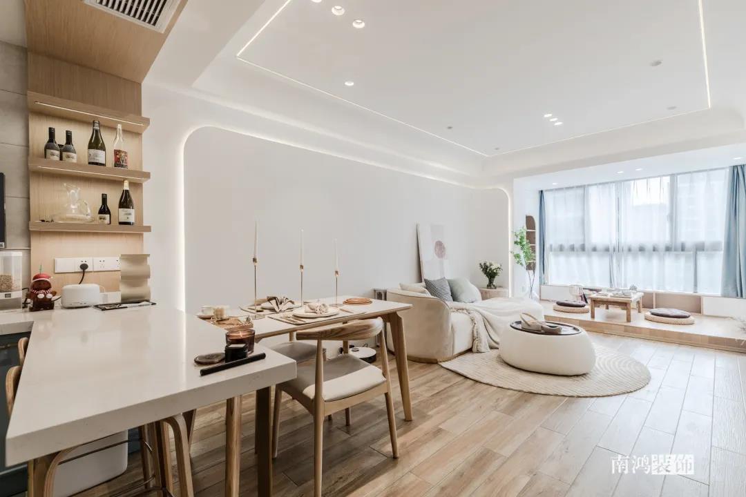 同理,客廳與餐廳都比較緊湊的話,不如就將二者做成一體式設(shè)計(jì),功能放在同一個(gè)空間里,視野會因此變得開闊許多。
