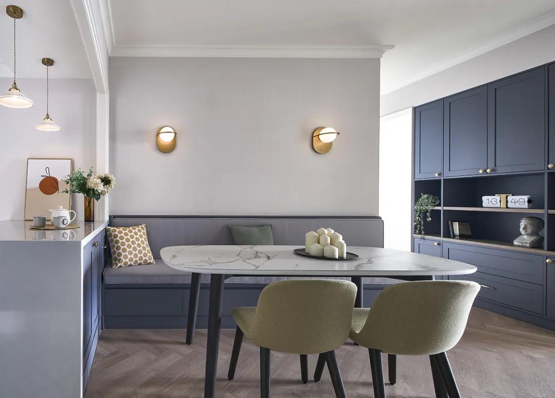 卡座設(shè)計(jì)具有節(jié)省空間和提供收納的雙重功用。卡座一般都是貼墻,只需留出一邊過道就行,而且卡座可以結(jié)合收納柜,使得餐廳的收納能力大大提高。